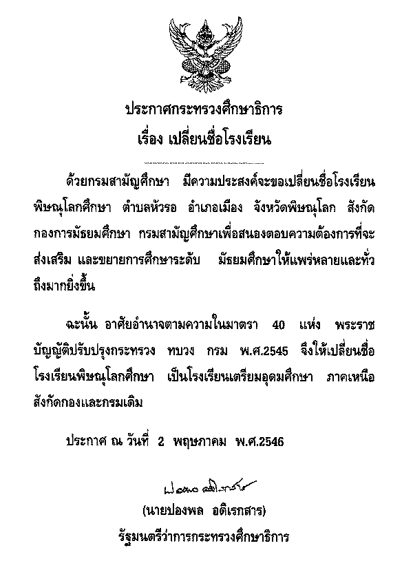 ในปี พ.ศ. 2542 ผู้อำนวยการโรงเรียนพิษณุโลกศึกษา นายจุฬา ทารักษา ได้ประสานงานกับผู้อำนวยการโรงเรียนเตรียมอุดมศึกษาคือ นายอัศวิน วรรณวินเวศร์ เพื่อขอจัดตั้งโรงเรียนเตรียมอุดมศึกษา ภาคเหนือ ที่โรงเรียนพิษณุโลกศึกษา และผู้อำนวยการโรงเรียนเตรียมอุดมศึกษาได้ตอบรับเป็นเบื้องต้น โดยรับโรงเรียนพิษณุโลกศึกษาเข้าเป็นเครือข่ายของโรงเรียนเตรียมอุดมศึกษา โดยได้ดำเนินการร่วมกันผ่านกรมสามัญศึกษาเพื่อขอจัดตั้งโรงเรียนเตรียมอุดม ศึกษา ภาคเหนือ แต่ได้ระงับไปช่วงหนึ่งเพราะผู้อำนวยการโรงเรียนเตรียมอุดมศึกษา นายอัศวิน วรรณวินเวศร์เกษียณอายุราชการ ต่อมาผู้อำนวยการโรงเรียนพิษณุโลกศึกษา นายมนู วัฒนไพบูลย์ ได้รับทราบการขอจัดตั้งโรงเรียนเตรียมอุดมศึกษา ภาคเหนือที่โรงเรียนพิษณุโลกศึกษา และได้รับนโยบายของกรมสามัญศึกษาในการประสานงานจัดตั้งโรงเรียนเตรียมอุดม ศึกษา ภาคเหนือ ที่โรงเรียนพิษณุโลกศึกษาจังหวัดพิษณุโลก เพราะเป็นจังหวัดที่เป็นศูนย์กลางของภาคเหนือมีสถาบันอุดมศึกษา เช่น มหาวิทยาลัยนเรศวร สถาบันราชภัฏ สถาบันราชมงคล ผู้อำนวยการโรงเรียนพิษณุโลกศึกษาได้ประสานงานกับผู้อำนวยการโรงเรียนเตรียม อุดมศึกษา กรุงเทพฯ ปัจจุบัน คือ นางพรรณี เพ็งเนตรเพื่อเข้าเป็นเครือข่ายโรงเรียนเตรียมอุดมศึกษา และผู้อำนวยการโรงเรียนเตรียมอุดมศึกษาได้ตอบรับไม่ขัดข้องในการขอเป็นเครือข่ายเมื่อวันที่ 2 พฤษภาคม พ.ศ. 2546นายปองพล อดิเรกสาร รัฐมนตรีว่าการกระทรวงศึกษาธิการในขณะนั้นได้ประกาศให้เปลี่ยนชื่อโรงเรียน พิษณุโลกศึกษา เป็น โรงเรียนเตรียมอุดมศึกษา ภาคเหนือ